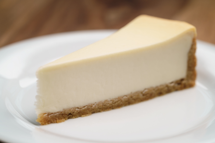 a slice of classic cheesecake made with graham cracker crust and luscious cream cheese filling