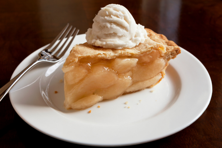 a flaky, buttery crust filled with tender, spiced apples served with a scoop of vanilla ice cream
