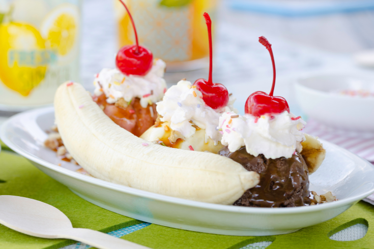 a split banana with 3 scoops of ice cream, whip cream, sauce, sprinkles & cherry on top