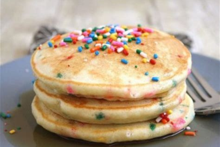 buttermilk pancakes with sprinkles, 2 pieces of meat and eggs | cheese is $1.00 extra