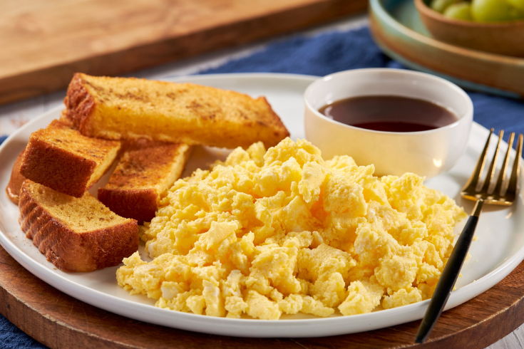 cinnamon french toast sticks, 2 pieces of meat and eggs with cheese