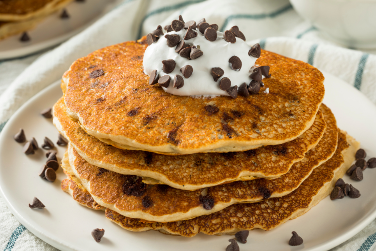 pancakes with chocolate chips and whip cream, meat and eggs | add cheese for $1.00