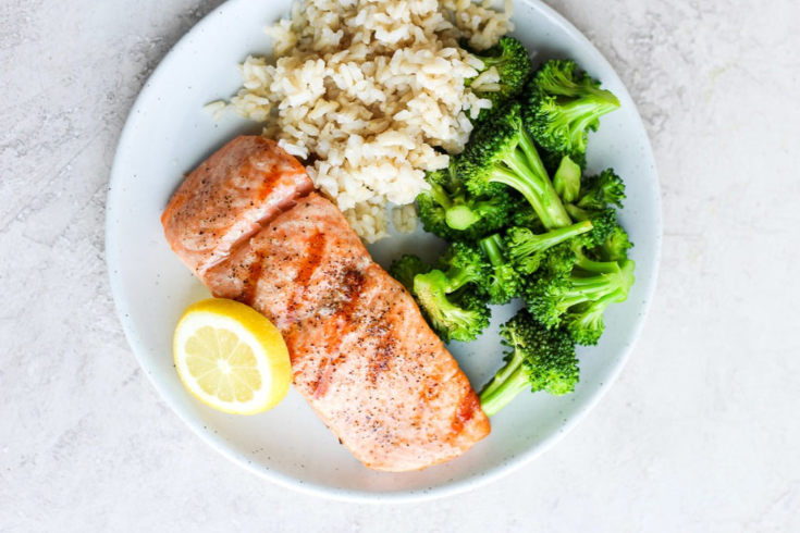 grilled salmon that is bursting with flavor, a touch of fresh squeezed lemon juice and garnished with parsley and your choice of 2 sides