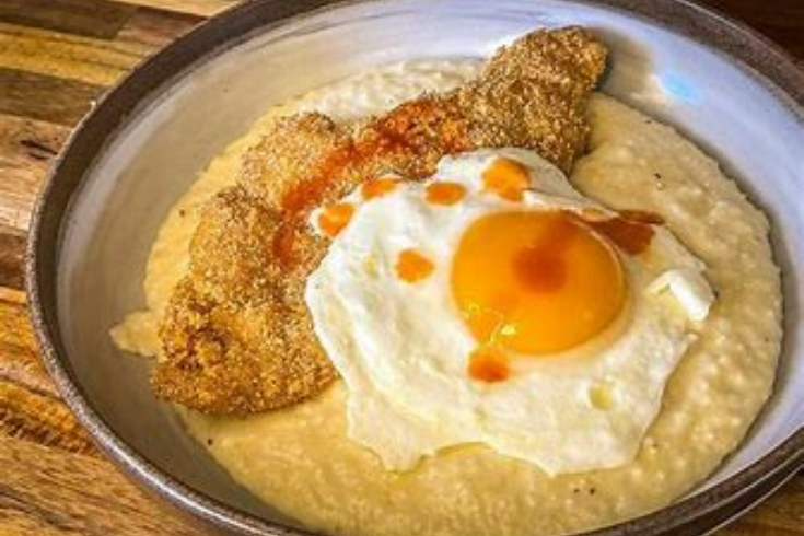 bowl of creamy grits, fried fish and an egg | cheese $1.00 extra