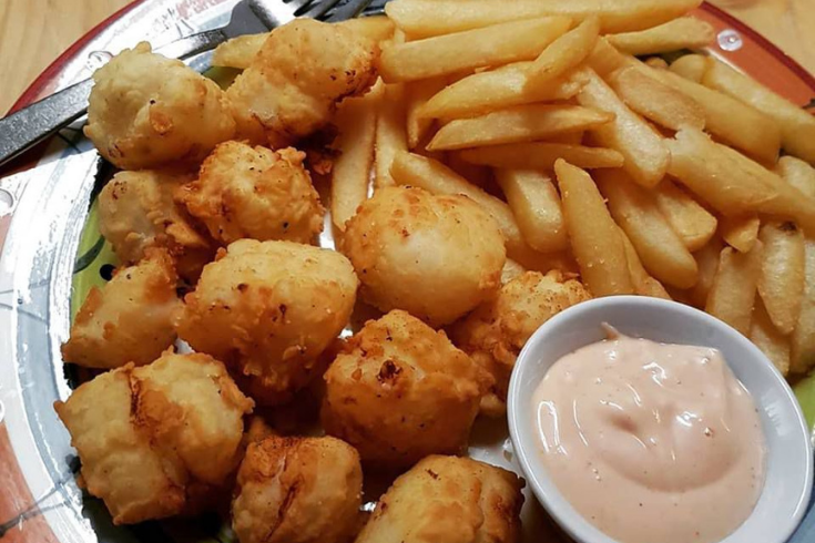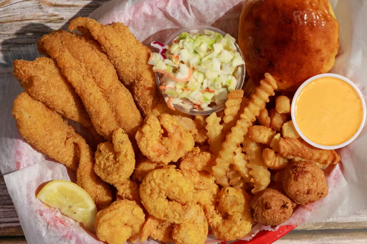 fried flounder, deep fried scallops, fried butterfly shrimps with your choice of 2 sides, soup & salad